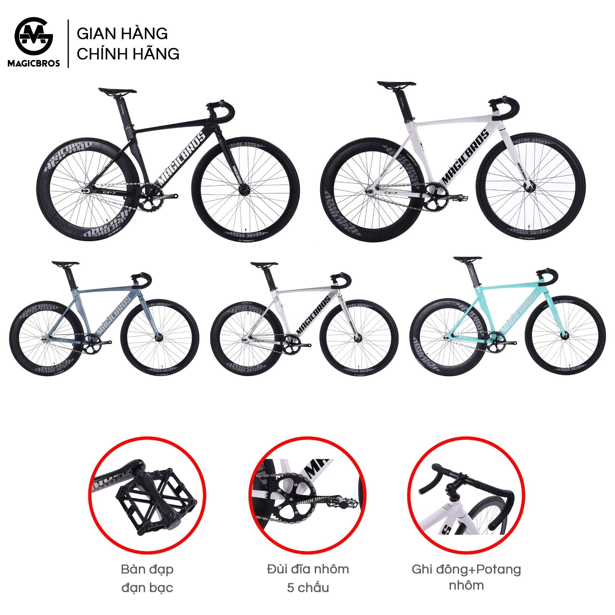 • Khung: Khung nhôm cao cấp 6061 không mối hàn • Càng: Nhôm MAGICBROS 700c • Đùi đĩa: Đùi nhôm 5 chấu 46T • Hub: Bộ hub LEGEND 32 lỗ siêu trớn • Trục giữa: Neco bi vòng • Vành: Vành nhôm trước 4cm, sau 6cm MAGICBROS PRO • Lốp: Compass 700*23C/25C • Ghi đông: Nhôm 31.8mm • Potang: Nhôm 31.8mm • Cọc yên: Nhôm MAGICBROS bản dẹt • Xích: hạt đậu • Size: S/M/L • Màu sắc: Đen/Trắng/Bạc/Xanh lam nhạt • Phù hợp với người cao từ 1,52-1,8m