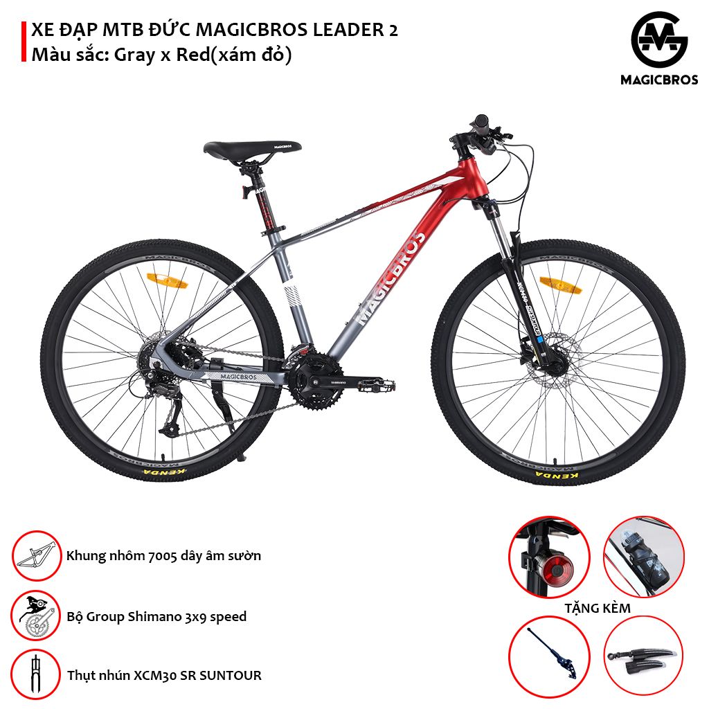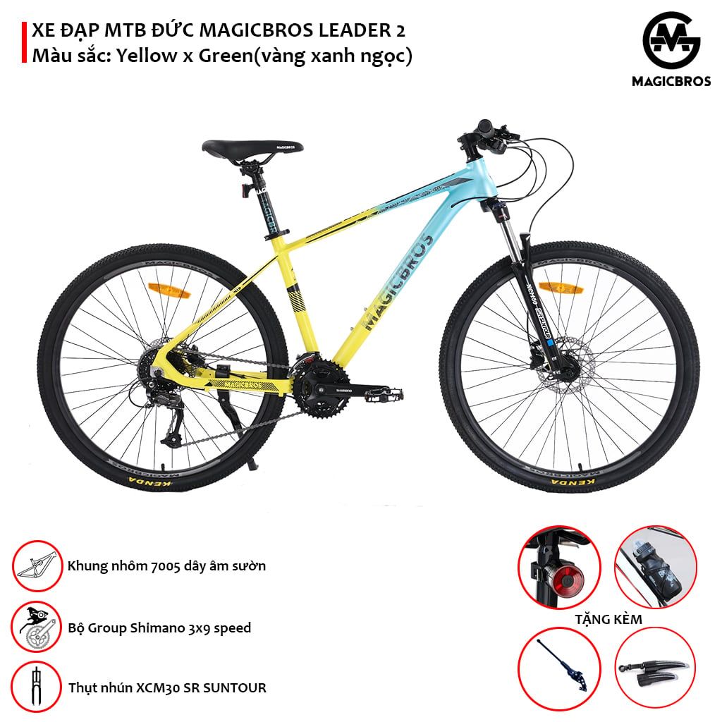 • Khung: Khung nhôm cao cấp 7005 không mối hàn, dây âm sườn 100% • Càng: Thụt giảm sóc SUNTOUR XCM 30 đầu khoá vai Taiwan • Bộ phanh: Phanh dầu thuỷ lực SHIMANO MT200 Indonesia • Tay đề: SHIMANO Altus M2010 3*9 speed • Gạt đĩa: SHIMANO Altus M370 3 speed • Củ đề: SHIMANO ALtus M370 9 speed • Đùi đĩa: SHIMANO 3 tầng TY315, 22-30-40T • Líp: SHIMANO HG200-9 9 speed • Trục giữa: cốt vuông, đạn bạc • Vành: Vành nhôm MAGICBROS 27.5 inch • Moay ơ (Hub): MAGICBROS đạn bạc • Lốp: KENDA 27.5*2.1mm • Ghi đông: Nhôm MAGICBROS • Potang: Nhôm MAGICBROS • Size: 15-17 inchs • Phù hợp với người cao từ 1,5-1,8m